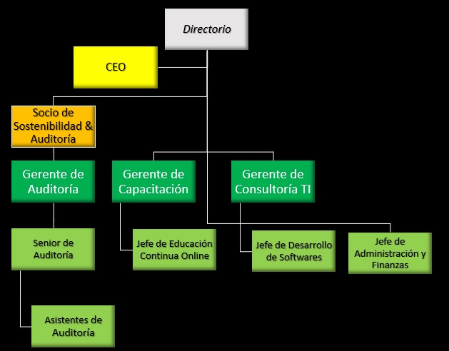 Somos una empresa de servicios de consultoría de alto impacto orientada a asesorar a directorios y altas administraciones privadas y públicas, en ámbitos de auditoría, emisión de reportes de sostenibilidad (nueva exigencia normativa) y capacitación. Nuesto gobierno corporativo está compuesto de ex ejecutivos y académicos de la Universidad de Santiago, Universidad de Chile y Universidad Católica Santísima de Concepción, con vasta experiencia en diferentes industrias fiscalizadas y con conocimiento en la dirección de PYME nacionales e internacionales.